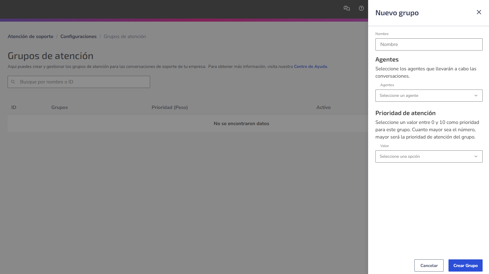 Los Grupos de atención representan las áreas operativas de la empresa en Zenvia Customer Cloud. Configúrelos para definir las participaciones en el chat de Atención de soporte.