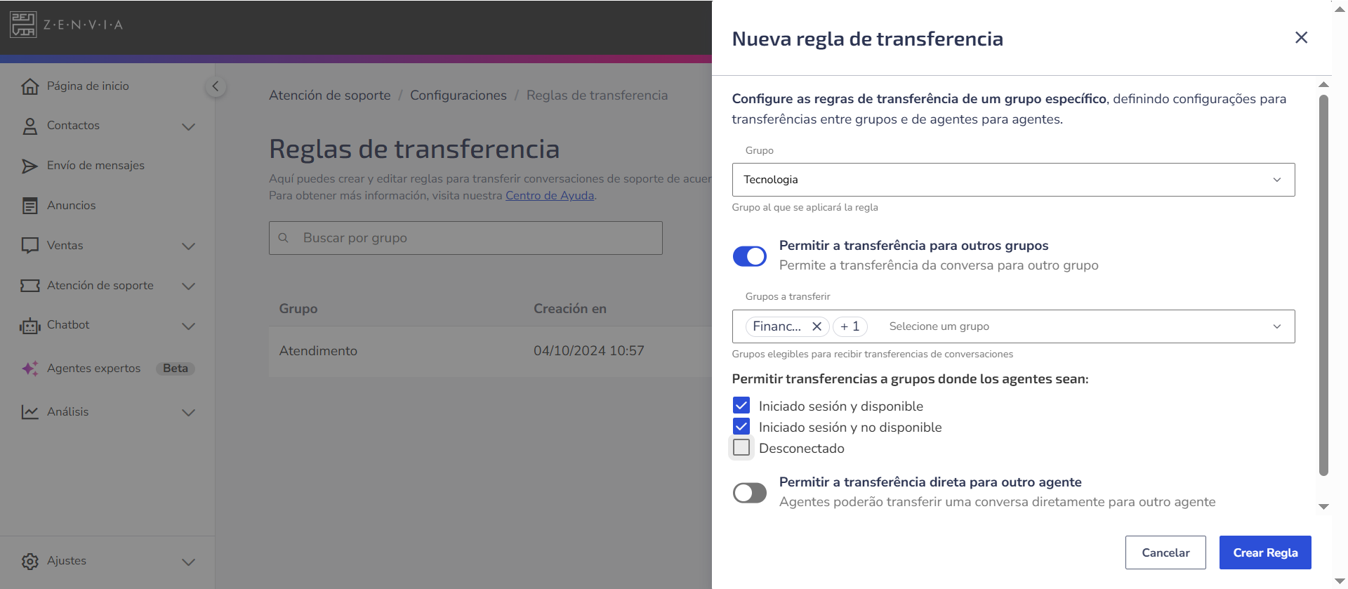 Configura las reglas de transferencia de un grupo específico, definiendo si las conversaciones pueden transferirse entre grupos o directamente entre agentes. Así, puedes gestionar de manera personalizada cómo ocurren las transferencias dentro de tu operación.