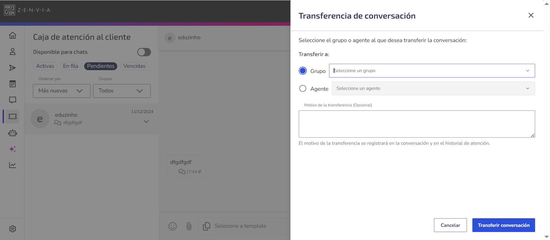 Los agentes podrán elegir a qué grupo o agente desean transferir la atención directamente desde la caja de atención al cliente. La transferencia siempre seguirá las configuraciones definidas para el estado de los agentes.