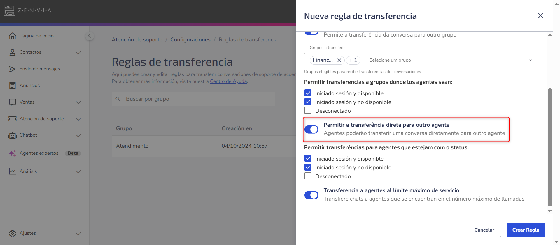 Configura las reglas de transferencia de un grupo específico, definiendo si las conversaciones pueden transferirse entre grupos o directamente entre agentes. Así, puedes gestionar de manera personalizada cómo ocurren las transferencias dentro de tu operación.