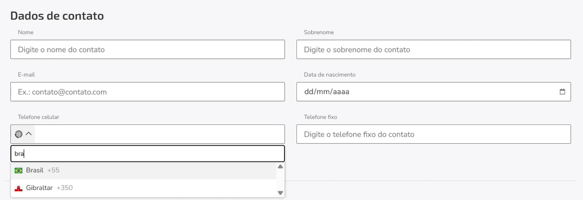 En el formulario de registro del contacto, selecciona el código de país correspondiente en el campo específico. Si prefieres, escribe manualmente el símbolo + seguido del código país para abrir las opciones.