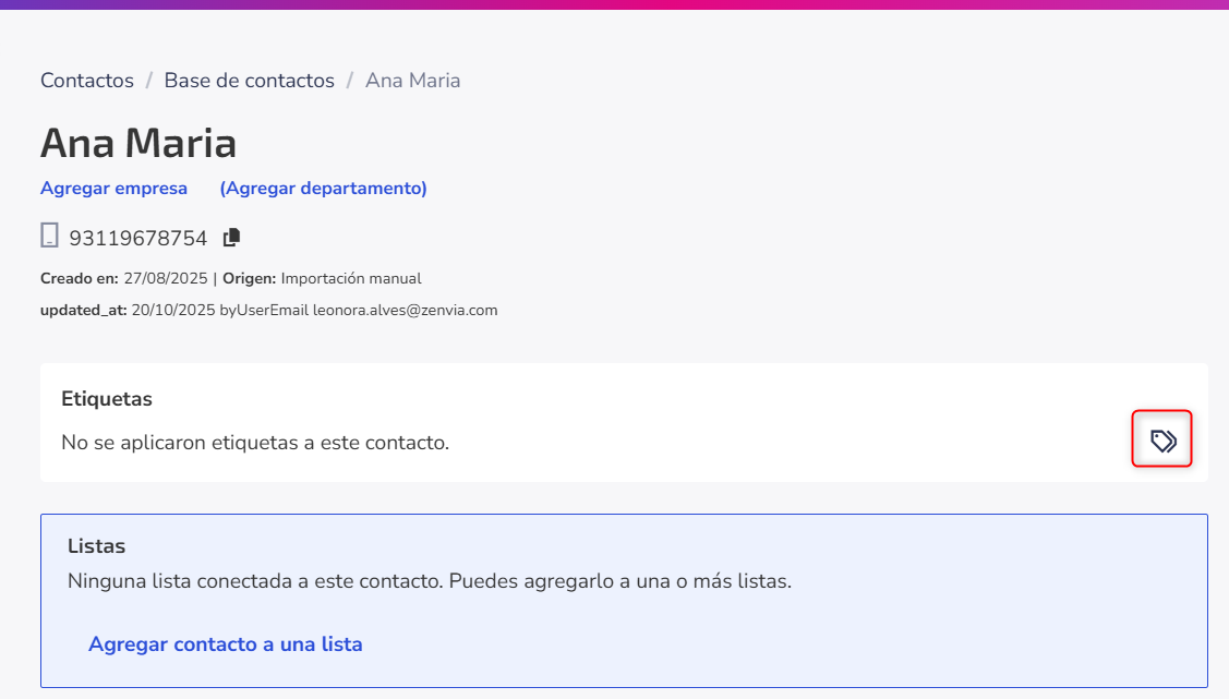 Las etiquetas ya creadas pueden ser modificadas y/o eliminadas tanto en la base de contactos como directamente en el perfil del contacto: