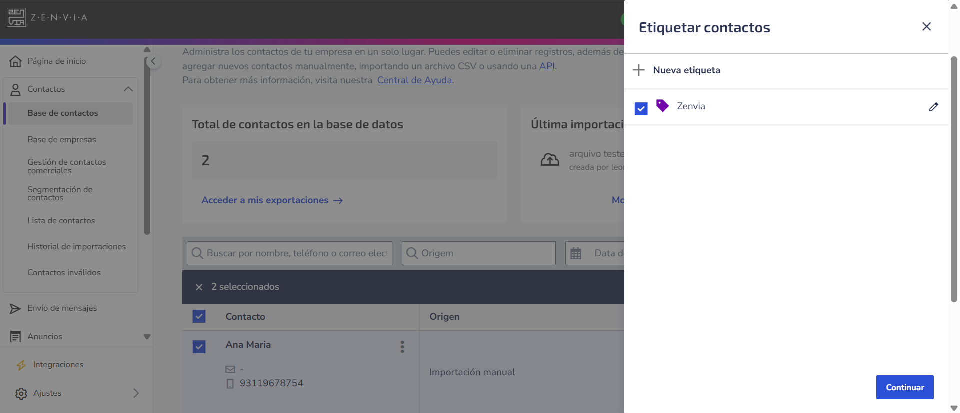 Base de contactos: Lugar donde las etiquetas se crean y se aplican directamente a los contactos. También permite filtrar y segmentar la base con base en las etiquetas atribuidas - por ejemplo, para generar listas específicas o identificar grupos de clientes.