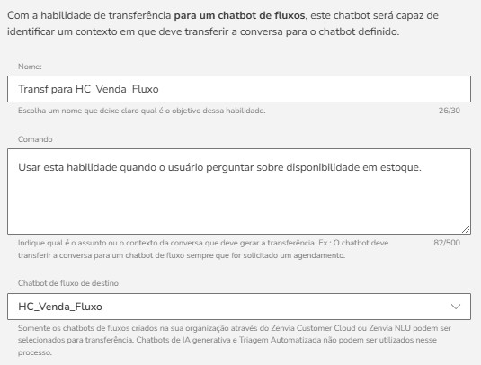 En este caso, al configurar la habilidad de Transferencia, el cliente debe definir un comando que indique exactamente cuándo debe ocurrir esta transferencia, como "Usar esta habilidad cuando el usuario pregunte sobre disponibilidad en stock", además de definir cuál será el chatbot de flujo de destino.
