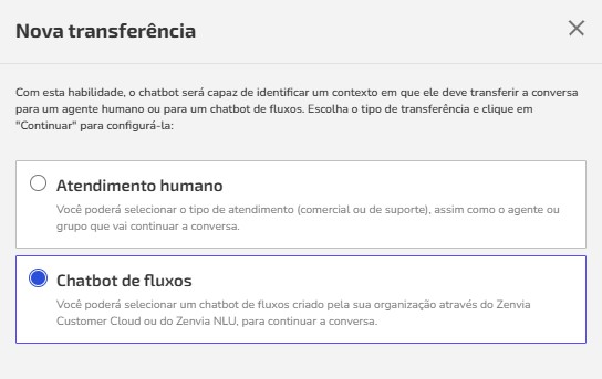 Acceda a Habilidades > Añadir habilidad > Transferencia > Chatbot de flujos.