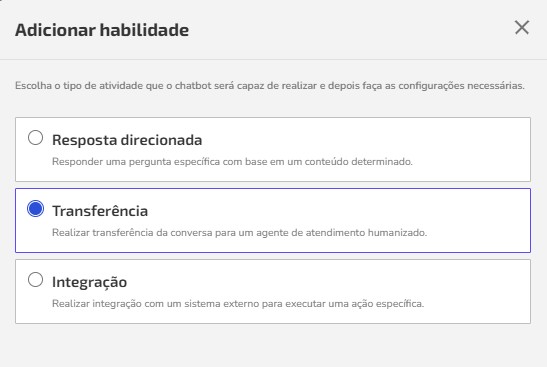 En este caso, al configurar la habilidad de Transferencia, el cliente debe definir un comando que indique exactamente cuándo debe ocurrir esta transferencia, como "Usar esta habilidad cuando el usuario pregunte sobre disponibilidad en stock", además de definir cuál será el chatbot de flujo de destino.