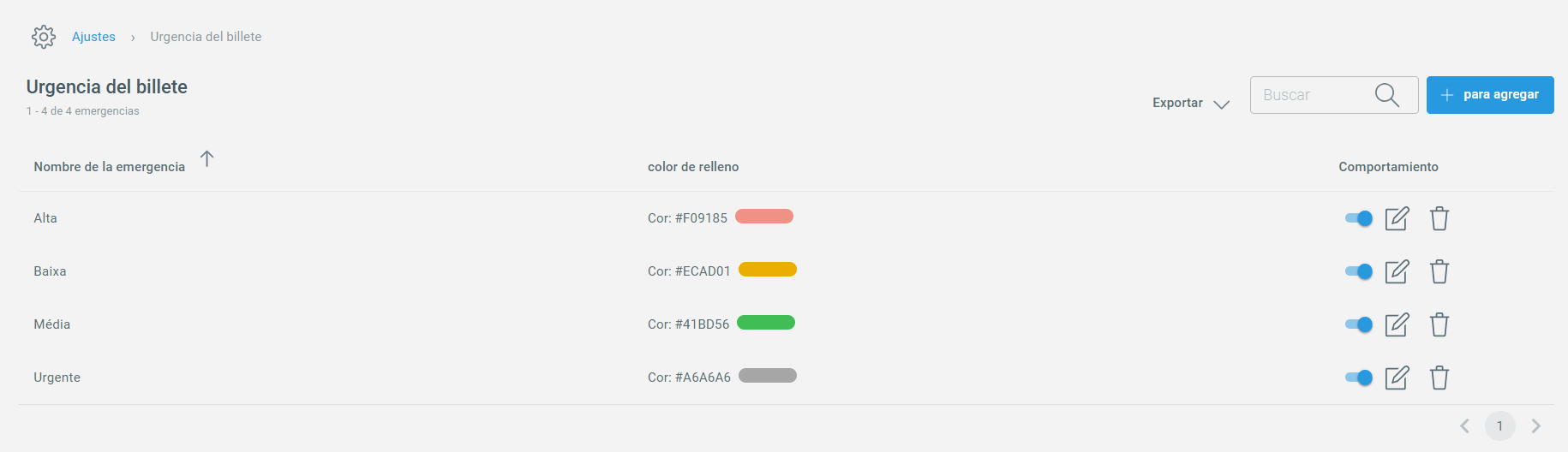 Para acceder a esta funcionalidad, vaya a Atención de soporte > Configuraciones > Urgencias. En la pantalla principal, verá las opciones predeterminadas: Alta, Baja, Media y Urgente.