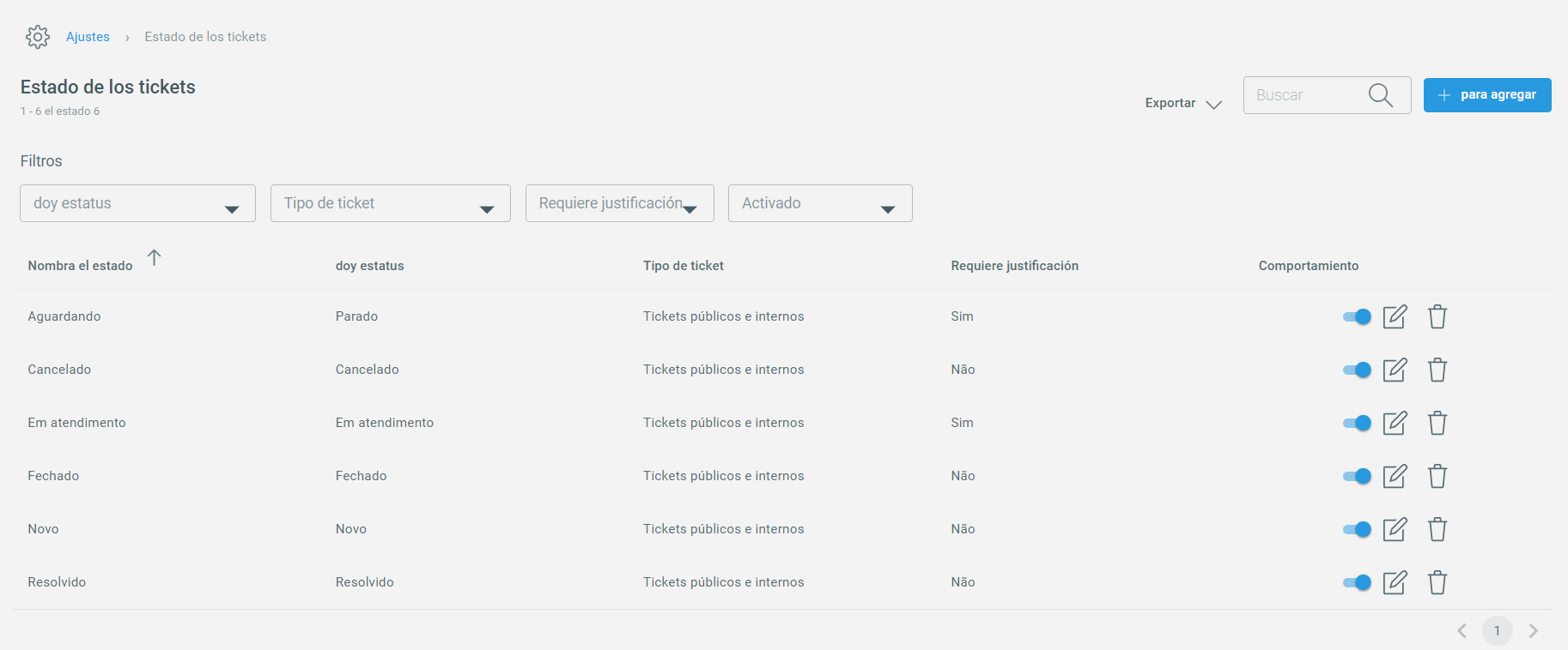 Para acceder a esta funcionalidad, vaya a Atención de soporte > Configuración > Estados. En la pantalla principal, verá las opciones predeterminadas: Esperando, Cancelado, En atención, Cerrado, Nuevo y Resuelto.