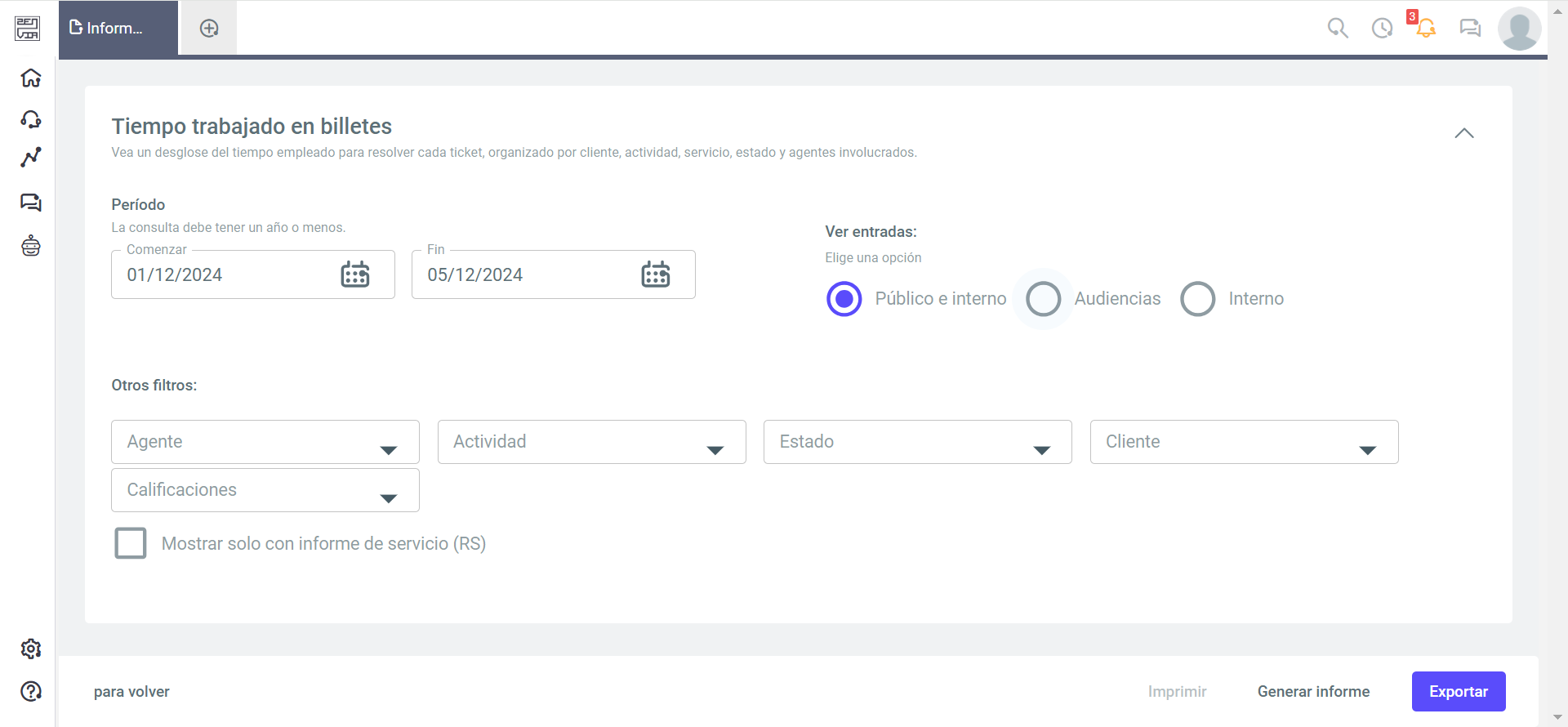 - Otros filtros: Puede filtrar por cliente, clasificación del cliente, servicio, categoría, urgencia y responsable.