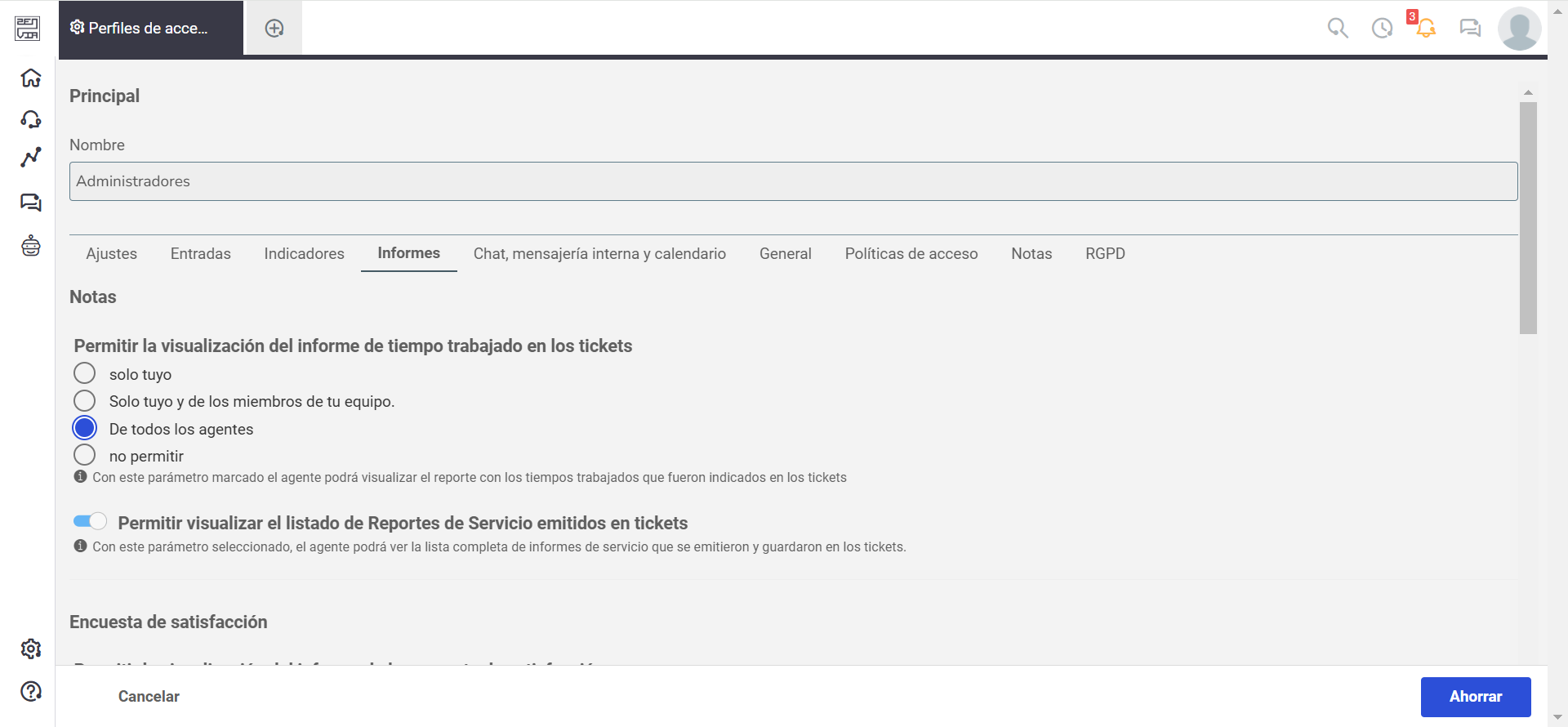 - Visualizar informe de tiempos trabajados en los tickets: Permite que el agente vea los tiempos trabajados registrados en los tickets.
