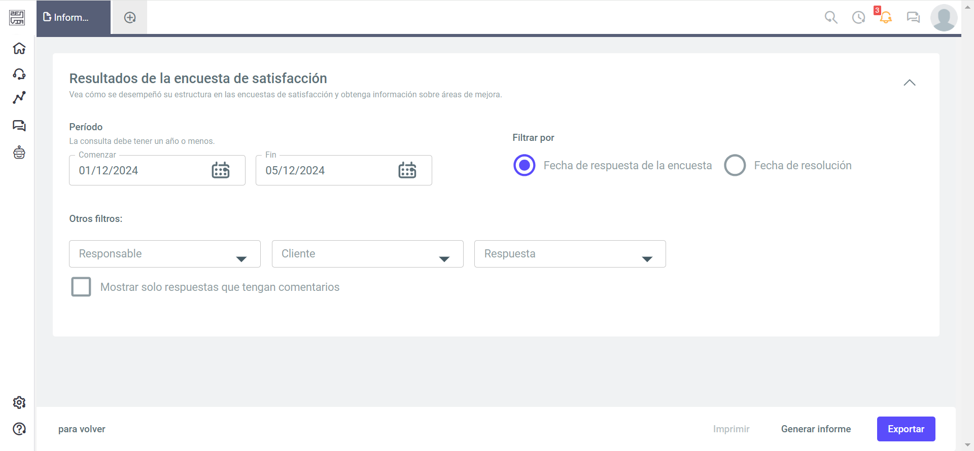 - Otros filtros: Puede elegir por responsable, cliente y respuesta.