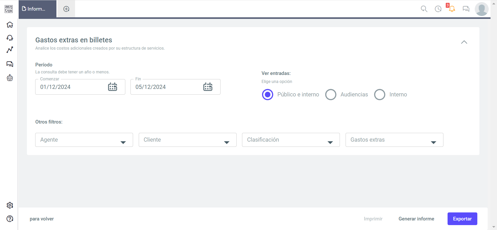 - Otros filtros: Puede filtrar por agente, cliente, clasificación y gastos extras.