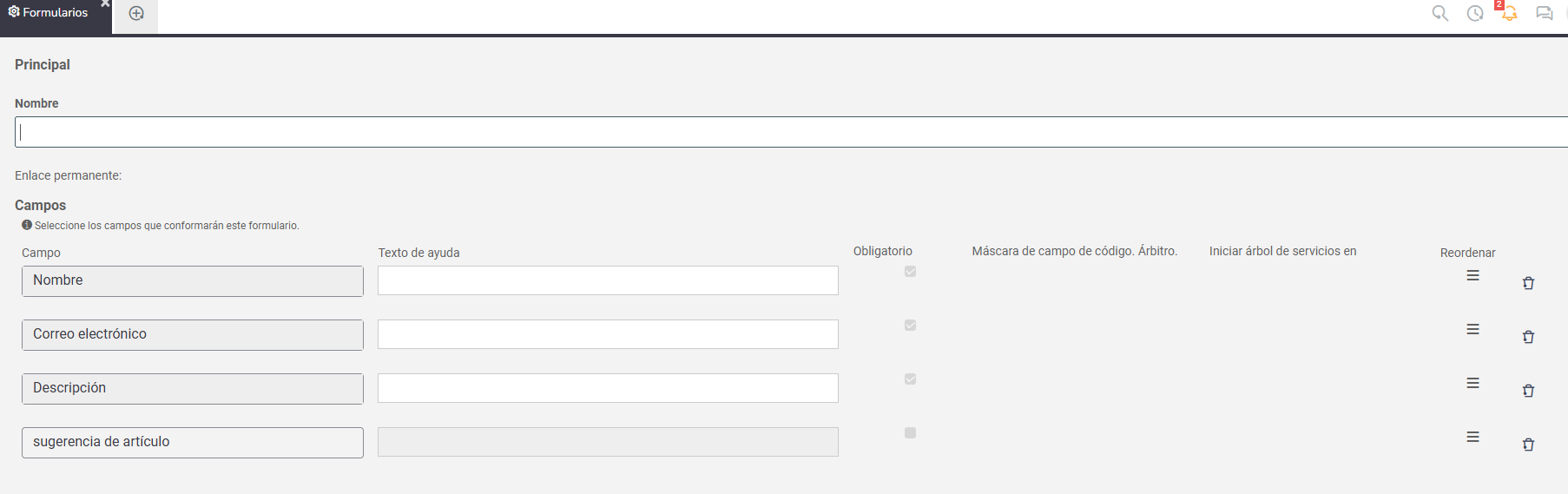 Para acceder a la funcionalidad, vaya a Atención de soporte > Configuraciones > Formularios.