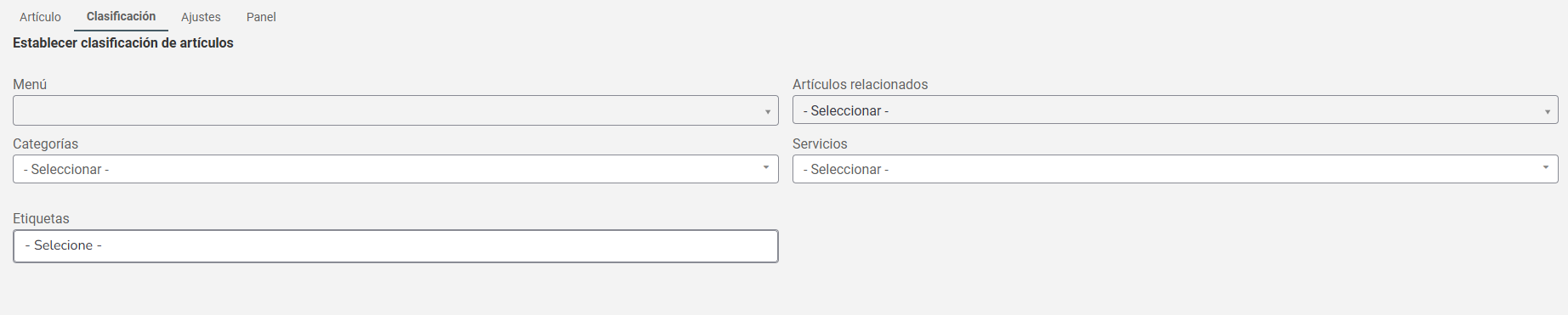 6. En la pestaña de Clasificación, complete la información sobre Menú, Categorías, Etiquetas Artículos relacionados;