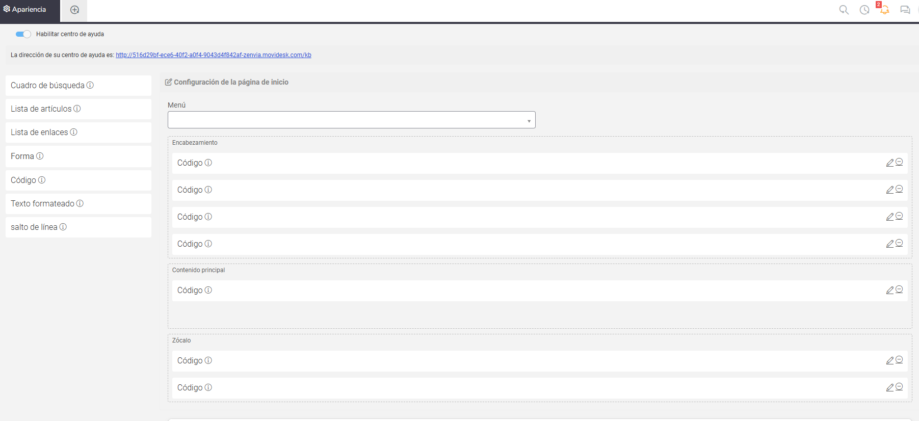 En Apariencia, puedes personalizar la apariencia de la página principal de tu centro de ayuda, adaptando el diseño para que armonice con la identidad de la marca.