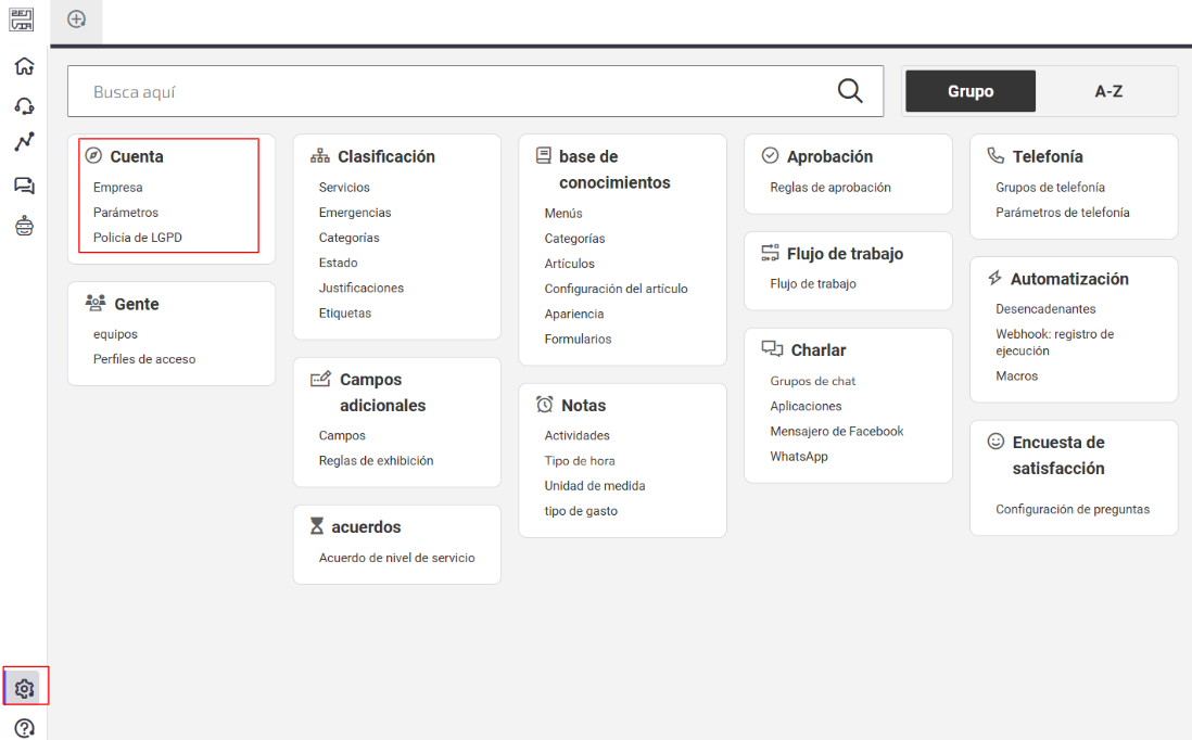 En la configuración de Cuenta del módulo de Atención al Cliente Empresarial de Zenvia Customer Cloud, encontrarás información importante sobre tu empresa, opciones para personalizar los parámetros del sistema y políticas de privacidad para el cumplimiento de la Ley General de Protección de Datos (LGPD).