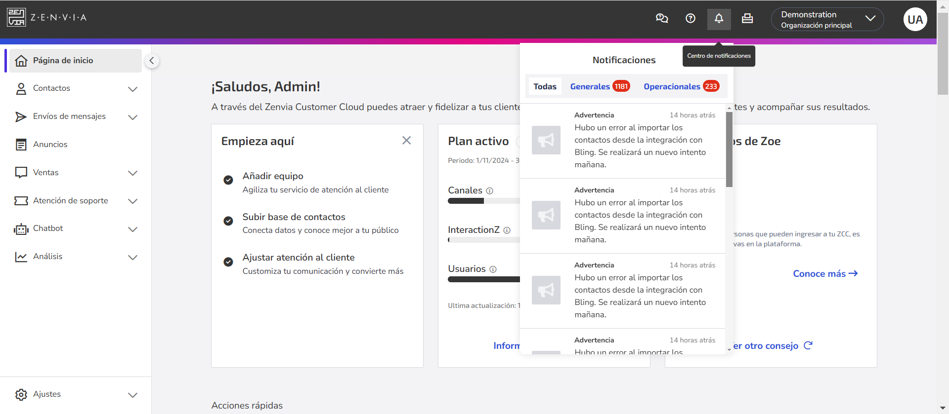 Aquí encuentras información esencial para el uso eficiente de la plataforma, incluyendo una visión general del rendimiento y de las interacciones de tu organización con los contactos, además de datos sobre el plan actual y el consumo.