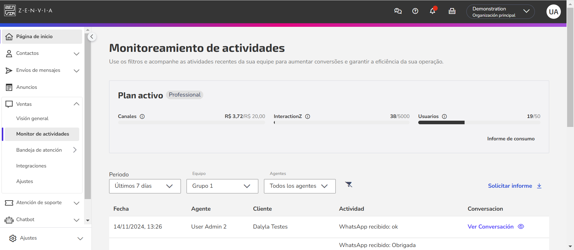 Consumo: La información que consultabas en el Estado de Cuenta ahora está disponible en el análisis de consumo. Aquí puedes ver tu plan contratado, el uso de tu paquete de canales y también el consumo de usuarios e interactionZ.