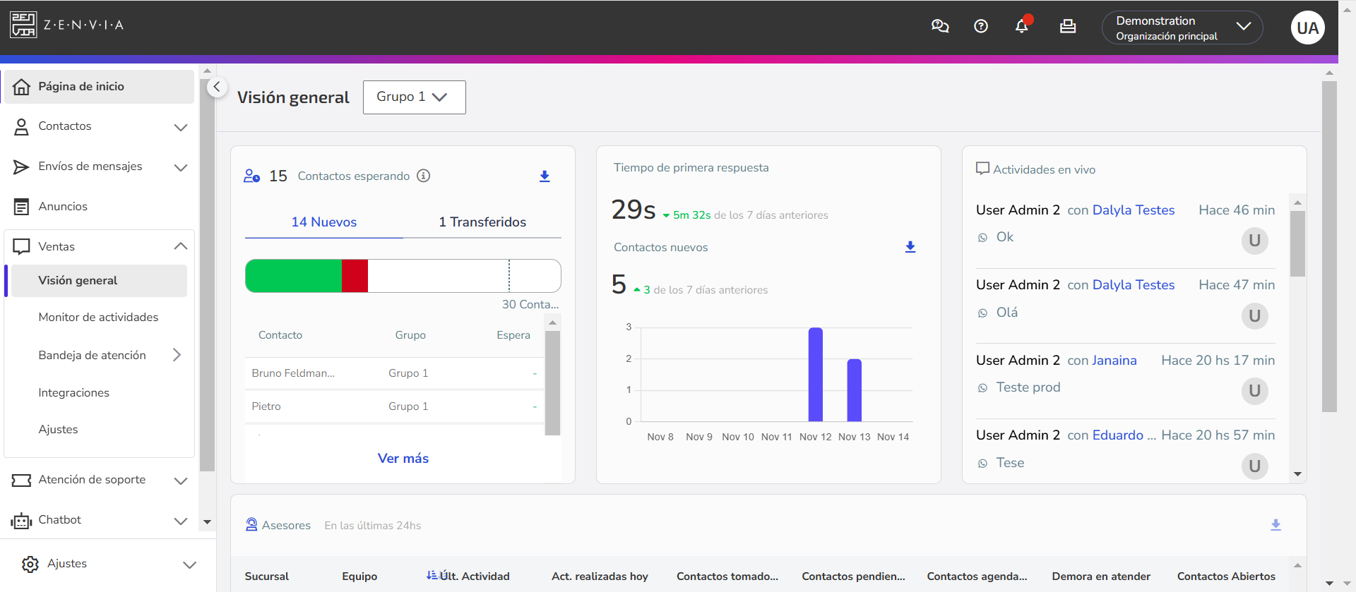 Inicio - ¡Novedad! | Aquí encuentras información esencial para el uso eficiente de la plataforma, incluyendo una visión general del rendimiento y de las interacciones de tu organización con los contactos, además de datos sobre el plan actual y el consumo. También sugerimos próximos pasos para optimizar el uso de la solución, ayudándote a gestionar tu cuenta y organizar operaciones de manera práctica. |