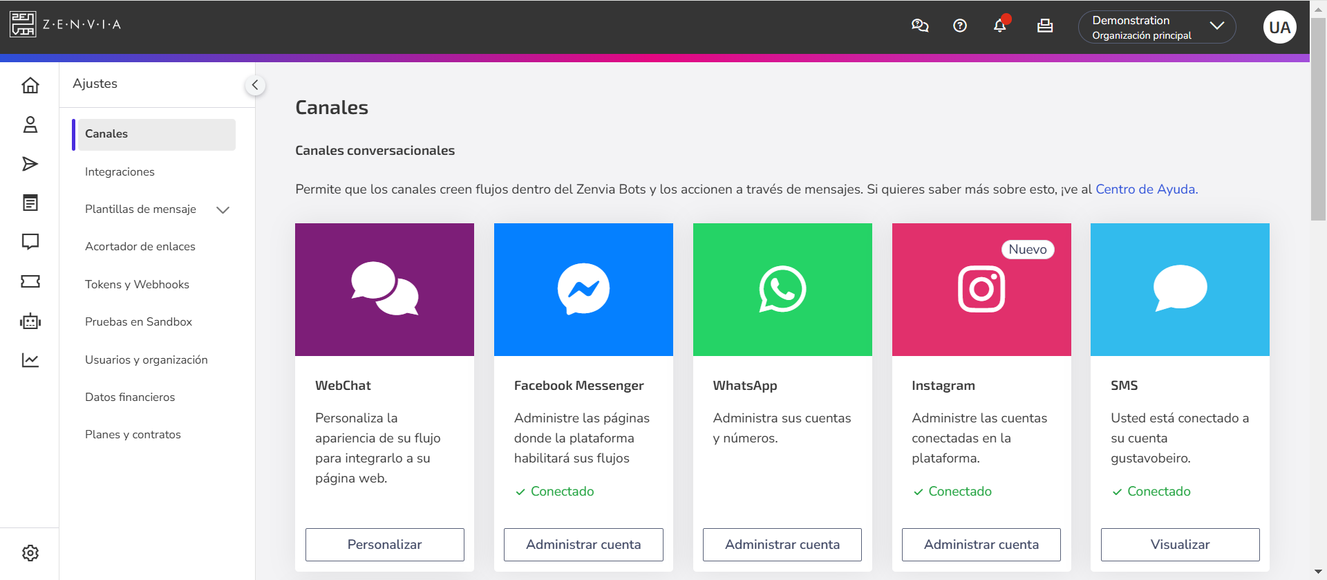 Además, puedes crear modelos de mensaje, gestionar tokens y webhooks, realizar pruebas en Sandbox y gestionar usuarios y organizaciones.