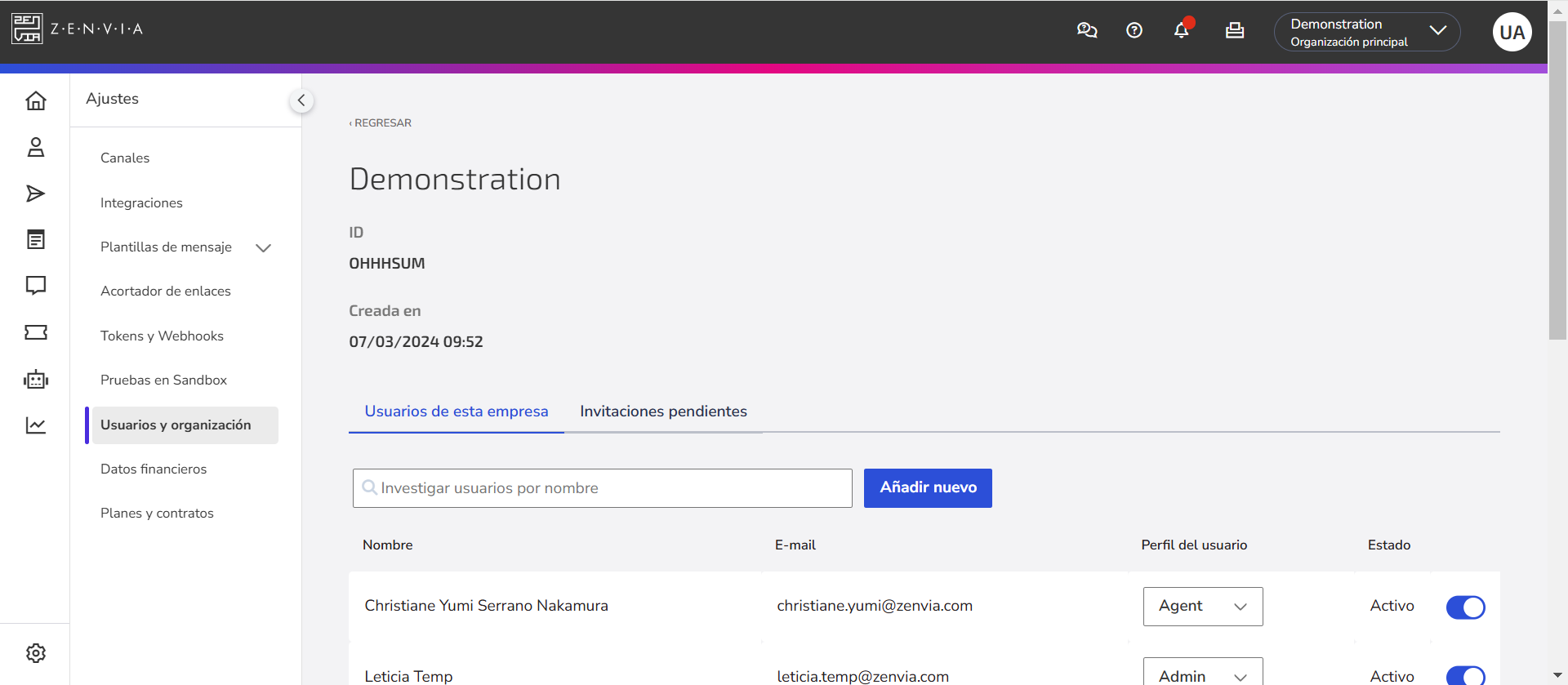 Ajustes | Permite configurar los canales y realizar la asignación de grupos de atención. Aprende cómo: Además, puedes crear modelos de mensaje, gestionar tokens y webhooks, realizar pruebas en Sandbox y gestionar usuarios y organizaciones. Una parte importante de este módulo es la adición de usuarios y la definición de sus perfiles de acceso, lo que permite determinar qué funcionalidades del software puede acceder cada uno. Para la atención comercial, se utiliza el perfil de agente, que básicamente tiene acceso solo a la bandeja de atención. Para más información, consulta el artículo Perfiles de acceso de usuarios. |