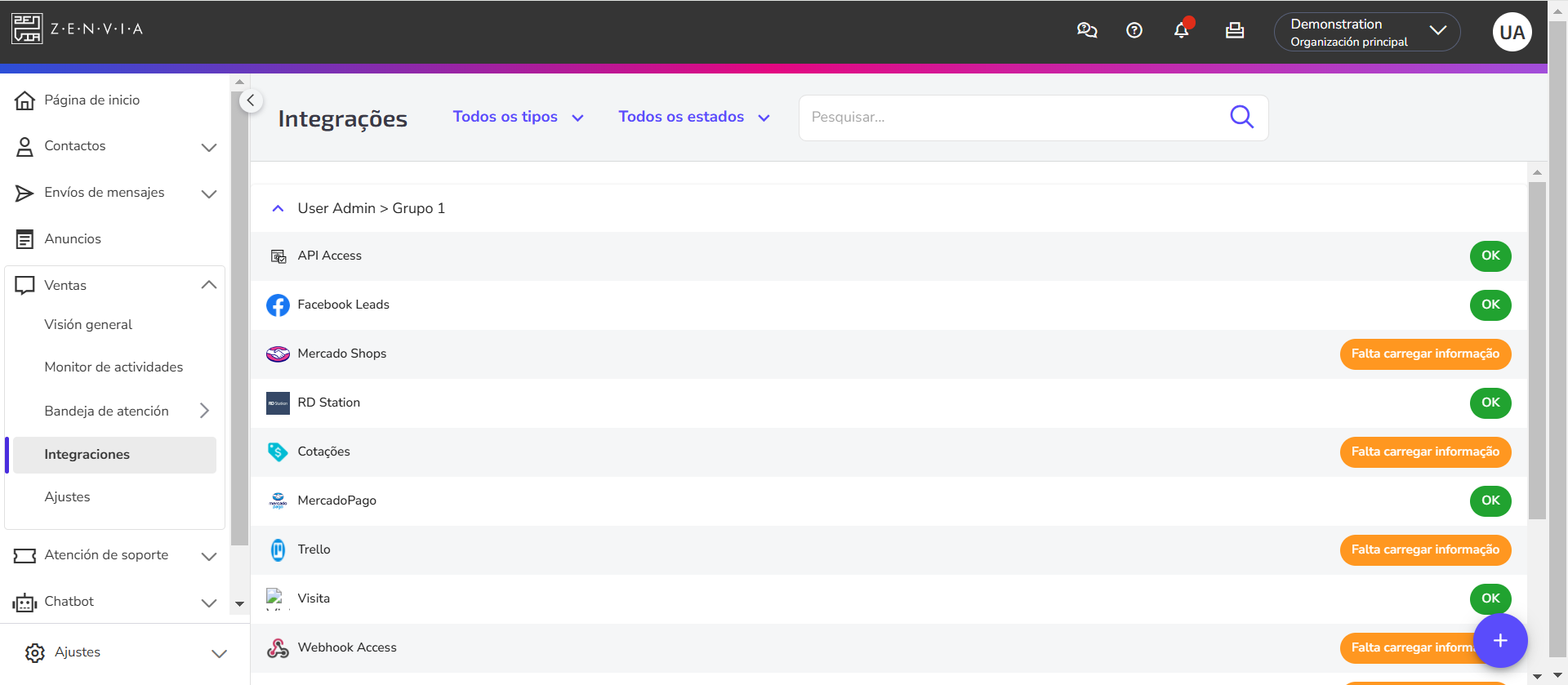 Ajustes | Permite configurar los canales y realizar la asignación de grupos de atención. Aprende cómo: Además, puedes crear modelos de mensaje, gestionar tokens y webhooks, realizar pruebas en Sandbox y gestionar usuarios y organizaciones. Una parte importante de este módulo es la adición de usuarios y la definición de sus perfiles de acceso, lo que permite determinar qué funcionalidades del software puede acceder cada uno. Para la atención comercial, se utiliza el perfil de agente, que básicamente tiene acceso solo a la bandeja de atención. Para más información, consulta el artículo Perfiles de acceso de usuarios. |