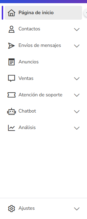 Ajustes | Permite configurar los canales y realizar la asignación de grupos de atención. Aprende cómo: Además, puedes crear modelos de mensaje, gestionar tokens y webhooks, realizar pruebas en Sandbox y gestionar usuarios y organizaciones. Una parte importante de este módulo es la adición de usuarios y la definición de sus perfiles de acceso, lo que permite determinar qué funcionalidades del software puede acceder cada uno. Para la atención comercial, se utiliza el perfil de agente, que básicamente tiene acceso solo a la bandeja de atención. Para más información, consulta el artículo Perfiles de acceso de usuarios. |