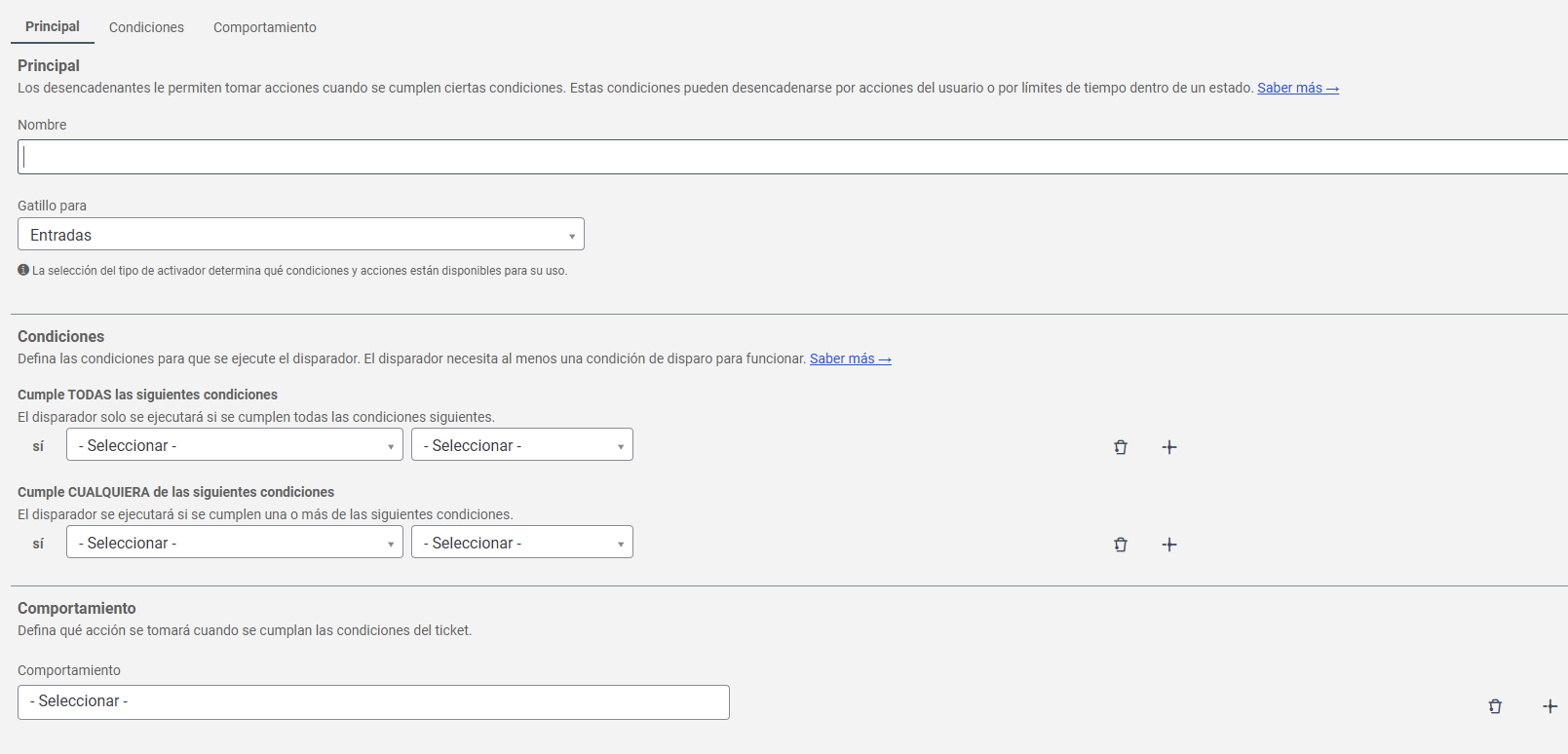 En los Disparadores, es posible configurar acciones automáticas basadas en condiciones específicas, como el envío de notificaciones, la actualización de estado y la asignación de tickets. Cuando se activa un disparador, la acción definida se ejecuta automáticamente, agilizando la gestión y la atención.