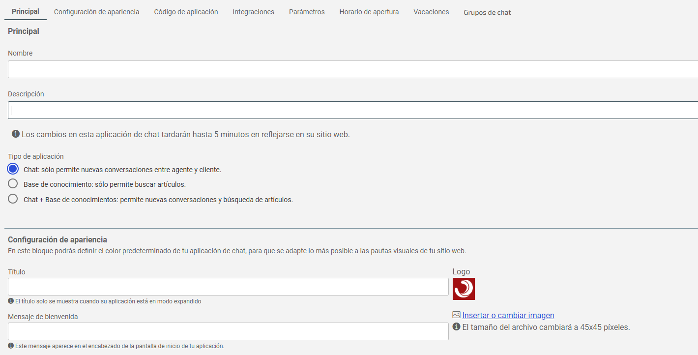 6 . En Definición de apariencia , personalice el título, mensaje de bienvenida, logotipo, colores, icono, posición y altura del chat;7. En Código de la aplicación , obtenga la clave para incluir el chat en el sitio web.