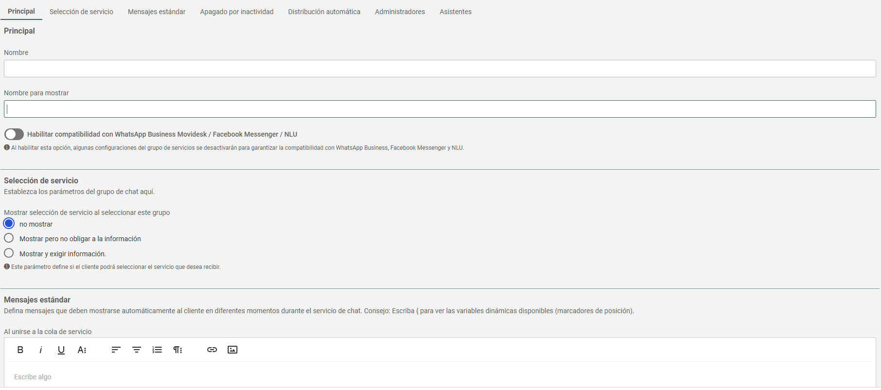 💡Tip: Para que el grupo de chat aparezca en las opciones de Messenger, active el parámetro de compatibilidad en Chat > Grupos de chat. Seleccione el grupo deseado y marque la opción Habilitar compatibilidad con WhatsApp Business Movidesk/Facebook Messenger.