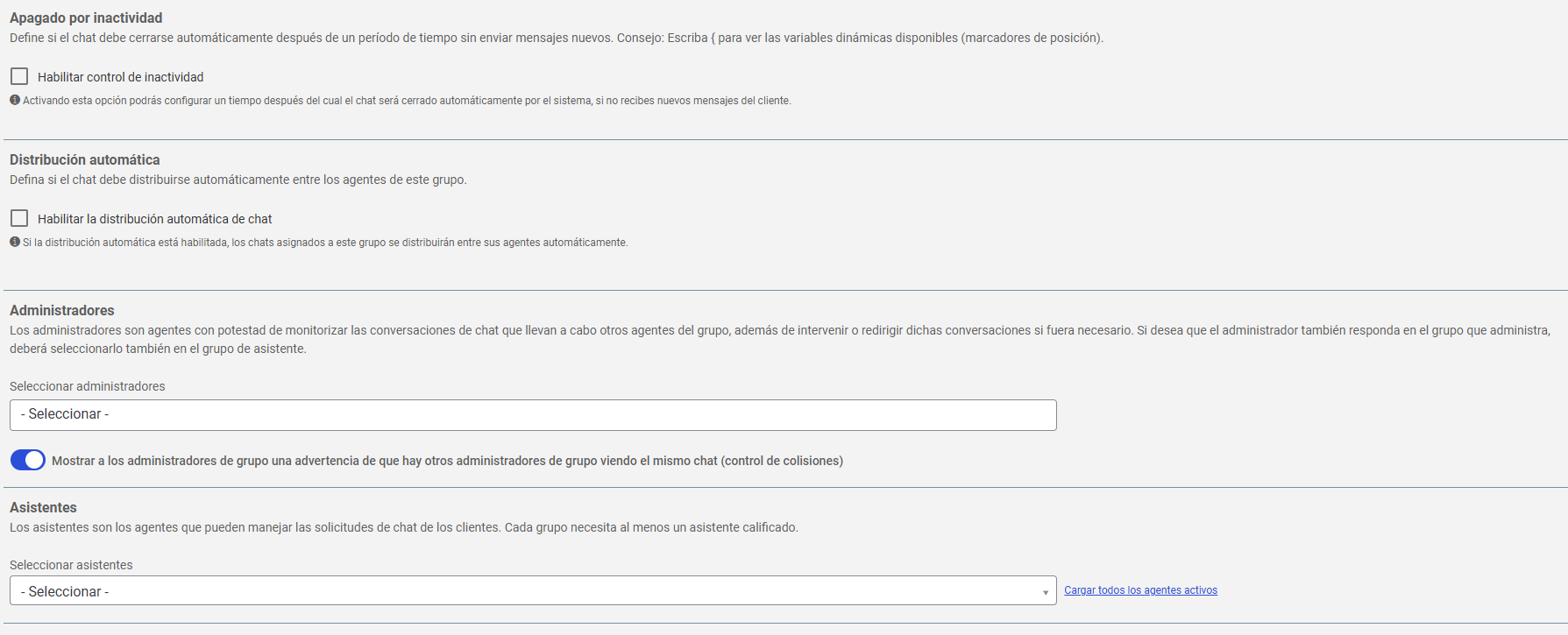 9. En Distribución automática, active para que el sistema distribuya los chats entre los agentes del grupo.10. En Administradores, elija quién puede monitorear las conversaciones del grupo;