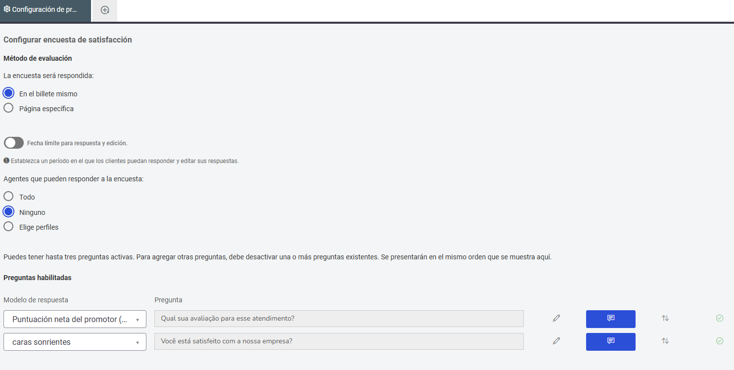 💡Tip: Es posible tener hasta tres preguntas activas. Para agregar más preguntas, desactive una o más existentes. Se mostrarán en el mismo orden configurado.