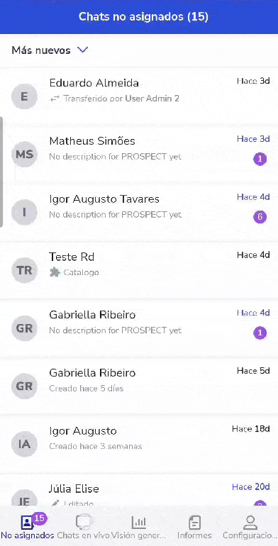 ⚠️ Atención: Solo los administradores pueden acceder a los análisis en la aplicación. En Visión General, están disponibles métricas como contactos en espera, nuevos contactos, transferencias y resumen de actividades. En Informes, se puede visualizar el rendimiento de la operación, con datos sobre tiempos de respuesta, interacciones, nuevas conversaciones y horarios de mayor actividad.