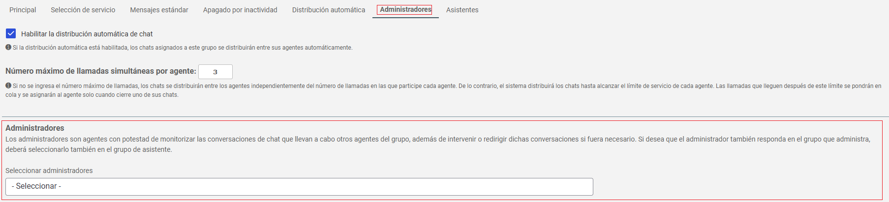 En el campo Seleccionar administradores, elija la persona que tendrá acceso a la pantalla de gestión del chat.