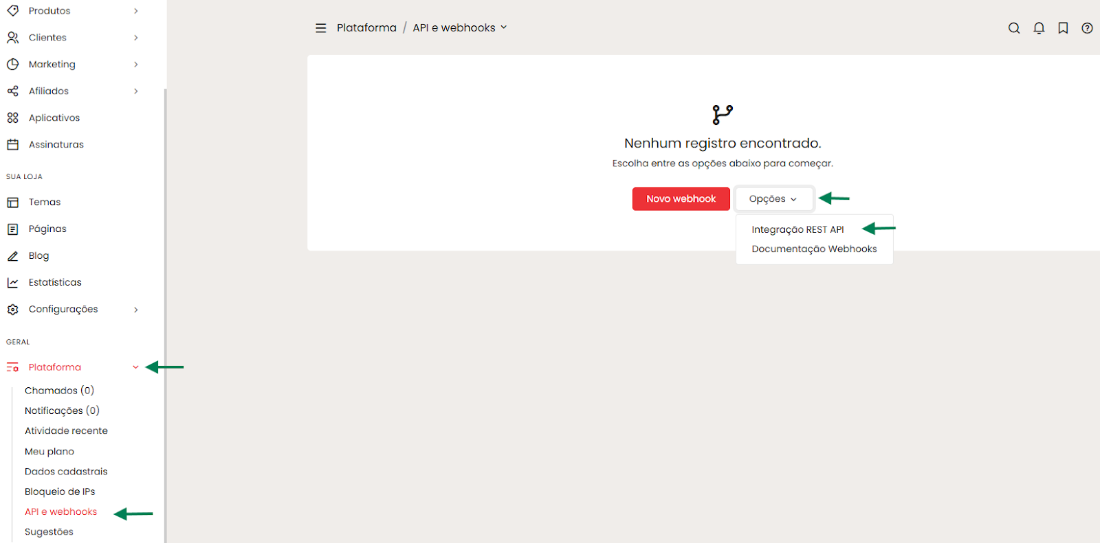 2. Busca la opción de API. Para ello, ve al menú lateral Plataforma > API y Webhooks > Integración con API REST (Plataforma > API e webhooks > Integração REST API).