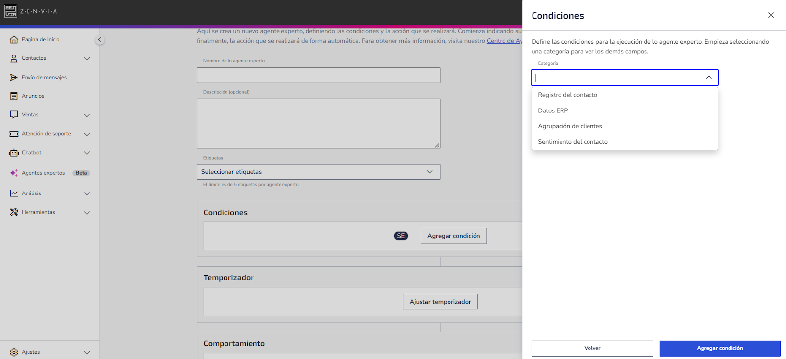 Después de completar la información de lo agente experto, este es el segundo paso en la creación de los agentes expertos: definir las condiciones para su ejecución. Comienza seleccionando una Categoría. Las condiciones son básicamente las reglas que establecemos para que un contacto sea o no impactado por una automatización.