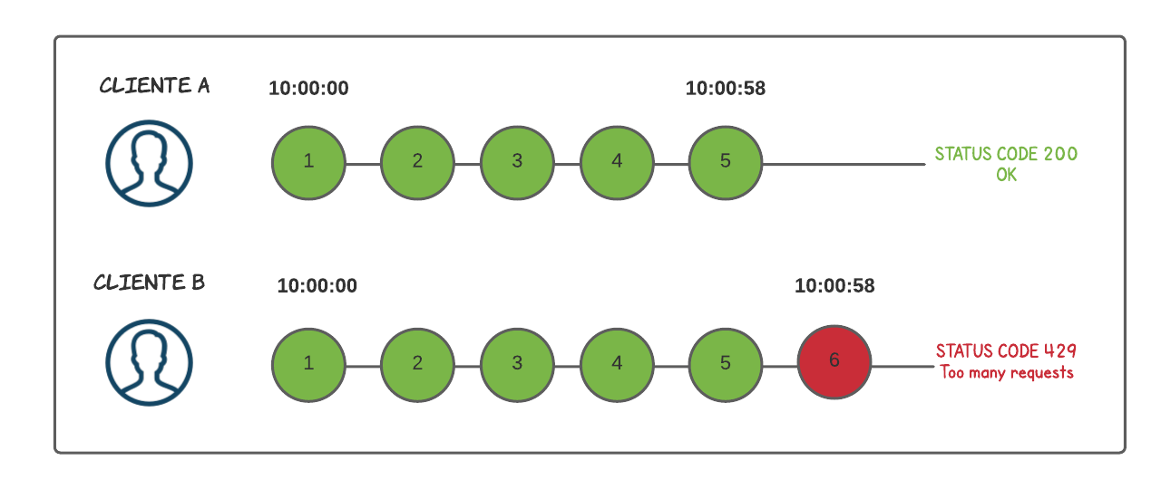 - Cliente A: Envía solicitudes dentro del límite de 10 por minuto, sin problemas.