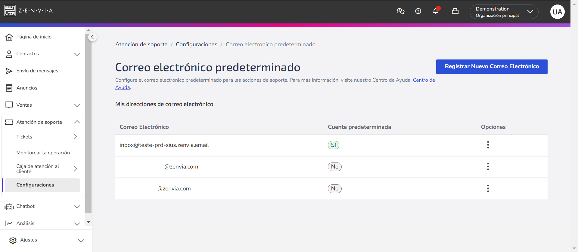 - Todos los correos electrónicos listados son los mismos que se configuraron previamente en Ajustes > Canales > Correo electrónico.