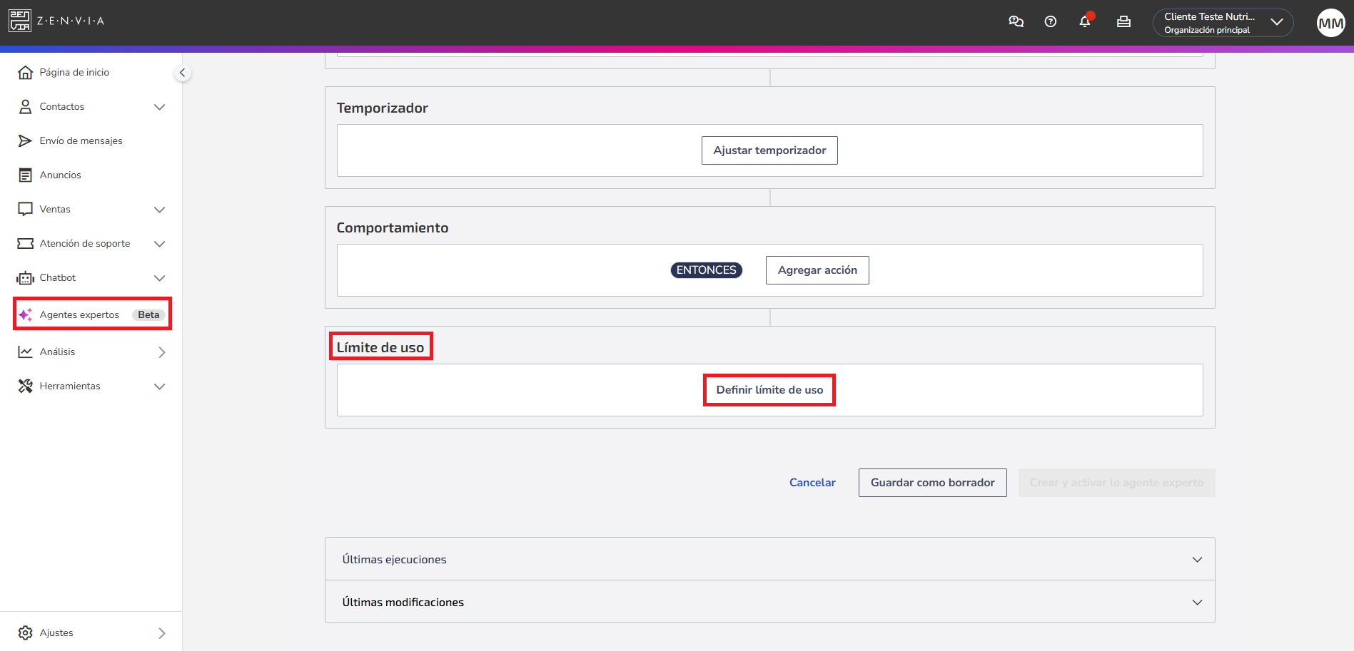Para acceder a esta funcionalidad, vaya a Agentes expertos > Límite de Uso.