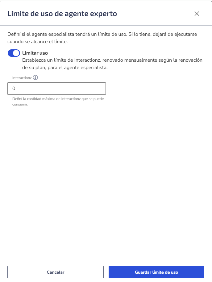 Limitar Uso: Al habilitar esta opción, puede definir la cantidad de interactionz, renovadas mensualmente, para el agente experto.