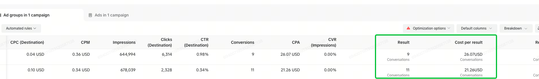 - Es la plataforma principal de gestión y análisis de campañas. Allí puedes ver clics, conversaciones iniciadas ("Conversations") y costo por conversación ("Cost per result").