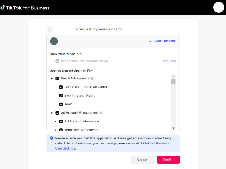 a. Activa la opción Conectar con TikTok para permitir el uso de esta cuenta en los anuncios.