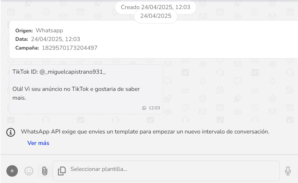- En la atención comercial, el mensaje generado por el anuncio de TikTok llega automáticamente a la caja de atención con la identificación del origen como WhatsApp, el ID de la campaña y el TikTok ID del contacto.