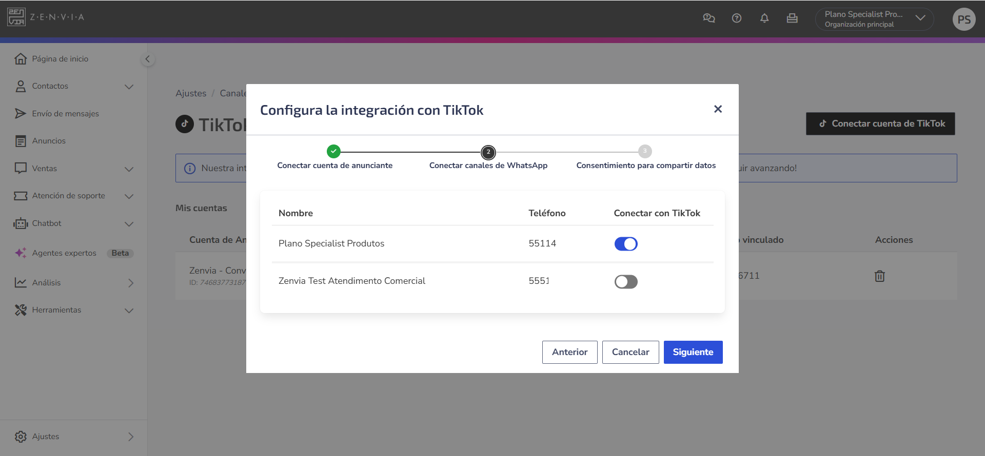 - Número de WhatsApp vinculado a la página de TikTok y registrado en Zenvia Customer Cloud.