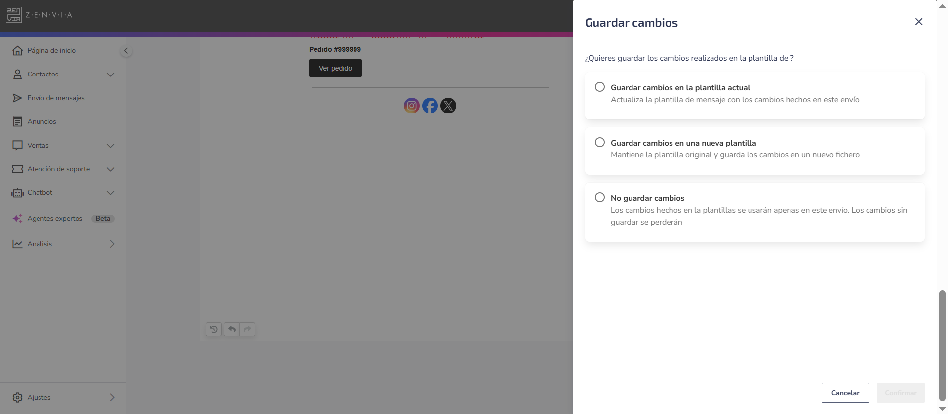 Si usas una plantilla existente, puedes actualizarla con los cambios, guardar como una nueva plantilla (sin modificar la original) o continuar sin guardar, manteniendo los cambios solo para este envío.