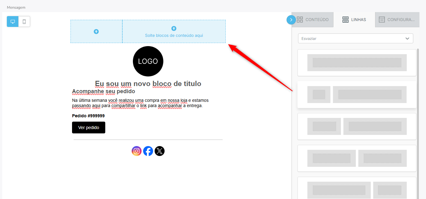 El contenido del correo electrónico se crea con bloques y filas que puedes arrastrar y soltar en el cuerpo del mensaje.