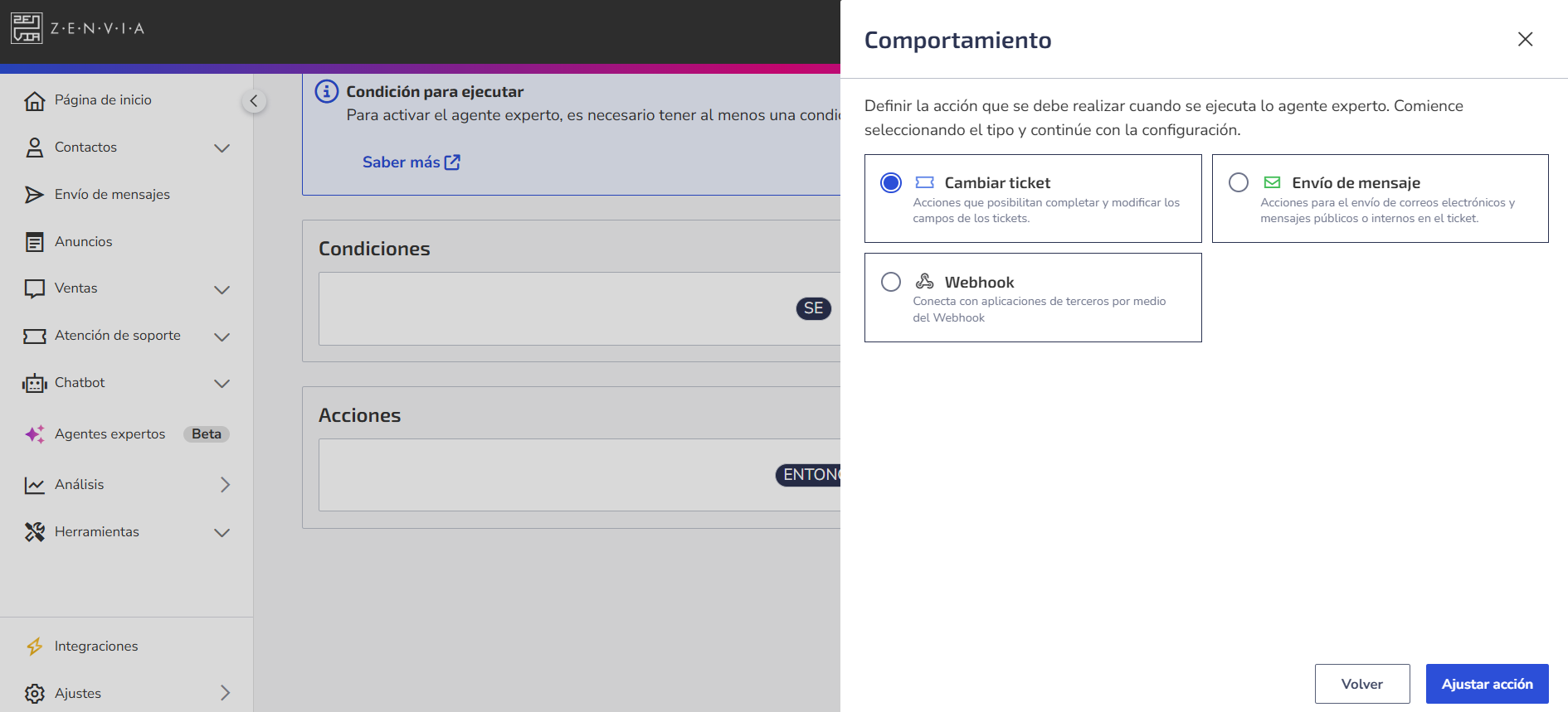 Ejemplo: Siempre que se abra un ticket, el agente especialista de soporte con la acción Webhook podrá enviar automáticamente los datos del ticket a una API externa.