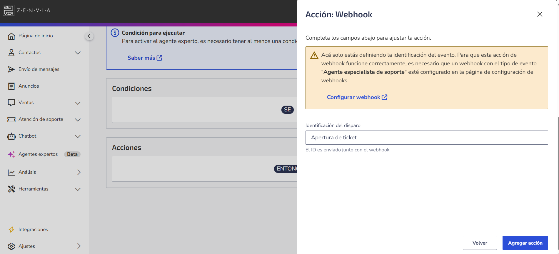 Ejemplo: Siempre que se abra un ticket, el agente especialista de soporte con la acción Webhook podrá enviar automáticamente los datos del ticket a una API externa.