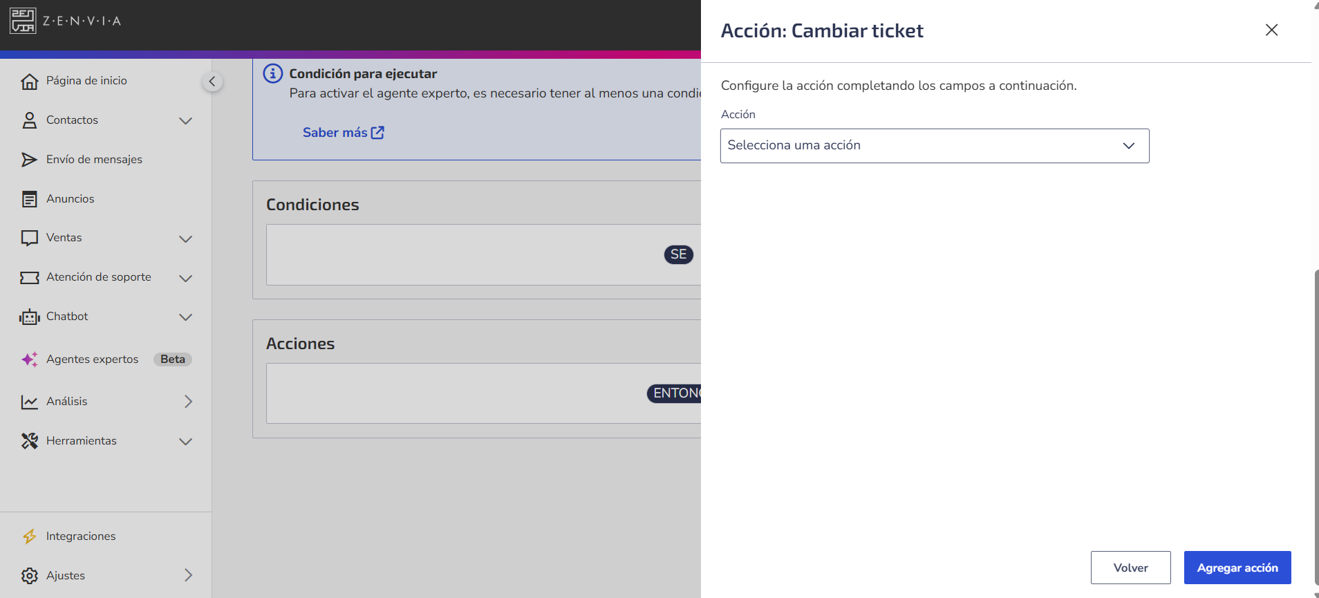 Los agentes especialistas de soporte son automatizaciones configurables en Zenvia Customer Cloud que permiten ejecutar acciones automáticamente dentro de un ticket, siempre que se cumplan condiciones específicas.