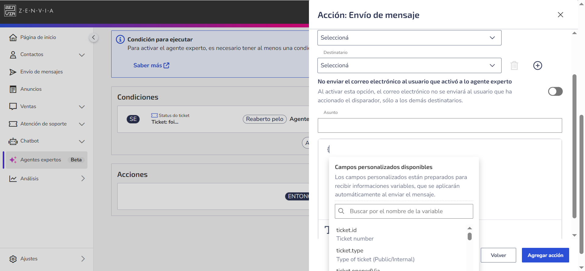 Personalización con variables Puedes hacer que tus mensajes sean más inteligentes y personalizados utilizando campos personalizados (también llamados variables). Son expresiones que el sistema reemplaza automáticamente por datos reales del ticket en el momento de ejecución del agente. Las variables se pueden usar en las siguientes acciones: